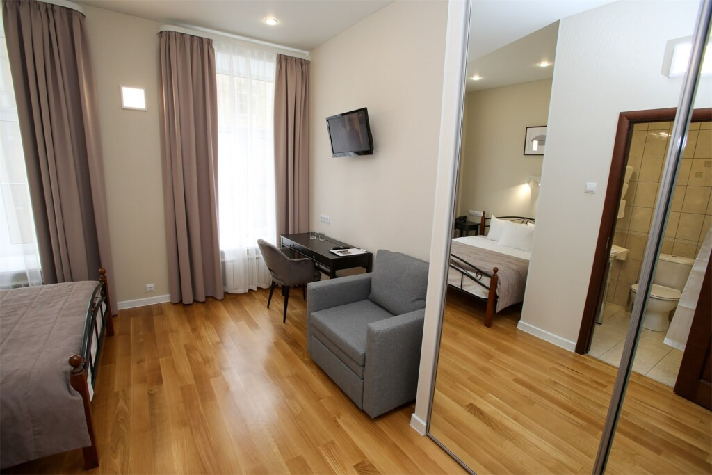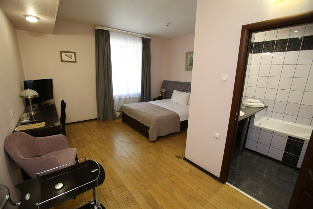 Напишу свежий отзыв об отеле, приехали совсем недавно.Самый главный плюс - это, конечно, расположение. Действительно, добираться до всех достопримечательностей очень удобно, ездили на транспорте только в пригороды и на вокзал. От остановок общественного транспорта тоже недалеко.Номер бронировали по интернету, заранее, поймав скидку на сайте. Оплатили первые сутки, прислали подтверждение. Все четко, гладко. Номер бронировали одноместный (там можно вдвоем), с нами был еще ребенок, дали двухместный без доплат.Заезд в 14.00, выезд в 12.00, но на респешен можно оставить чемоданы и гулять, чем мы и воспользовались.Номер хороший, мебель не старая, телевизор жк, большой, сантехника исправная. Убирали каждый день, претензий нет. К минусу могу отнести, что он был на 5 этаже, а с ребенком и коляской без лифта – не очень удобно, но не критично. И еще нет кулера, хотелось иногда чая попить )К дополнительным плюсам отнесу – бесплатный Wi-Fi, сейф. Можно бесплатно звонить по городу, заказывать еду в ресторане по меню, за доставку вроде как ничего не берут дополнительно, но мы не пользовались этим, старались посещать новые места. Завтраки проходят в кафе рядом «Русская забава». Неплохой выбор, голодным никто не остался и для ребенка всегда можно выбрать что-то. Персонал приветлив, все вопросы стараются решить, тут все хорошо.В целом отель очень достойный, расположение шикарное, рекомендую!Если есть вопросы – отвечу!
